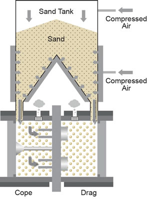 Aeration Sand filling makes mold difference, Low pressure air fluidises the sand to fill the complicated edges & Pockets in the pattern with sand Primary sand filling that is ideal for the production of molds with superior accuracy & uniformly high strength Achieves uniform sand filling density Uniform sand filling is realized without causing bridging at the complicated pattern profiles & throat of narrow pattern. Air consumption is reduced by as much as 70% compared to blow system. Low noise —75dB (A)